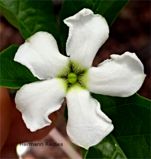 O gênero desta planta deve ser Randia. Por enquanto, o epíteto fica indeterminado. Veja a discussão na página do indivíduo 2.Randia é um gênero com flores unisexuadas. A foto mostra um ramo de uma planta masculina, com pequenas inflorescências de dois ou mais flores e/ou botões florais.