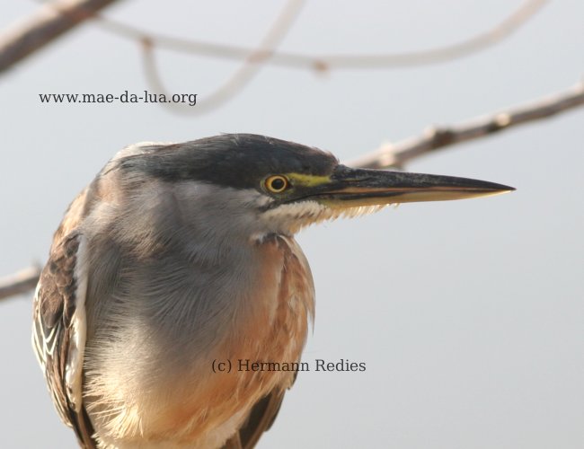 acima de um ramo ou de uma estaca de cerca etc., na espera de um peixinho ou de uma rã que