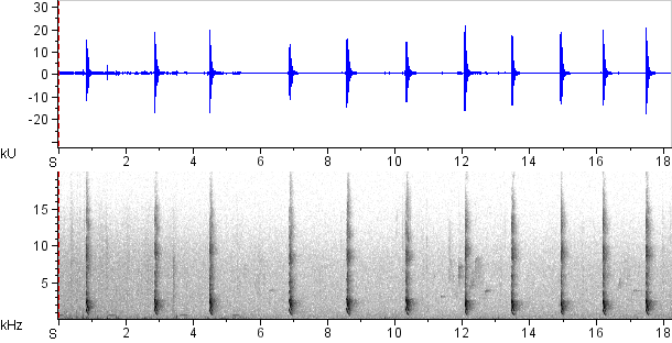 Os sons apresentados aqui são de um indivíduo que vocalizou durante o dia, primeiro espontaneamente e depois em resposta à playback (acima: depois de playback). Observei e gravei esta ave durante pelo menos 10 minutos.